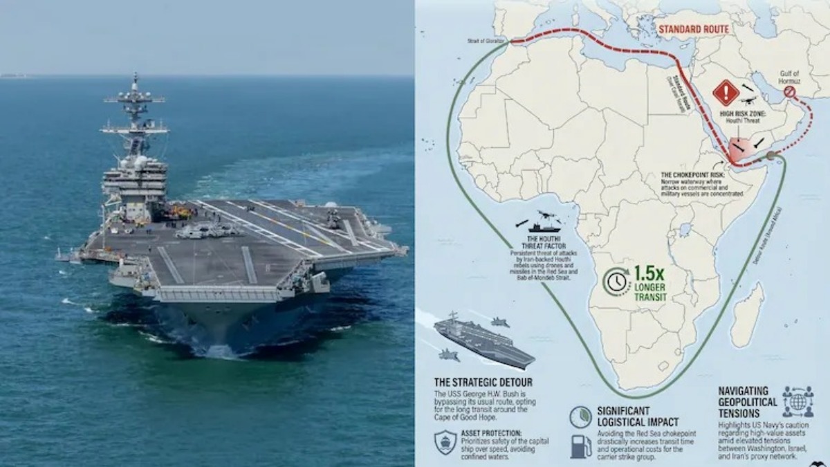 நியூயார்க்: மத்திய கிழக்கில் நிலவும் போர் பதற்றங்களுக்கு மத்தியில், அமெரிக்காவின் அதிபயங்கர 'நிமிட்ஸ்' ரக விமானம் தாங்கி போர்க்கப்பலான யுஎஸ்எஸ் ஜார்ஜ் ஹெச்டபிள்யூ புஷ், வழக்கமான பாதையைத் தவிர்த்து ஆப்பிரிக்காவைச் சுற்றி நீண்ட தூரம் பயணம் செய்து வருவது உலக நாடுகளைத் திகைக்க வைத்துள்ளது. அதாவது வழக்கமான தூரத்தை விட 1.5 மடங்கு தூரம் "ஹூதிக்களின் தாக்குதலுக்கு பயந்து சுற்றி வந்திருப்பது பேசுபொருளாகி உள்ளது.