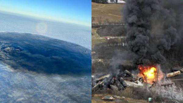 ஒகையோ மாகாணத்தில் ஏற்பட்ட இந்த ரயில் விபத்து தொடர்பான புகைப்படம் ஒன்று இணையத்தில் வைரலாகி வருகிறது. இந்த புகைப்படம் மக்கள் பலரை அதிர்ச்சிக்கு உள்ளாகி உள்ளது. அதன்படி வானத்தில் கருப்பு நிறத்தில் இருக்கும் ஆசிட் மேகக்கூட்டத்தின் போட்டோக்கள் வெளியாகி உள்ளன. இதற்கு அருகே விமானத்தில் பறந்த மக்கள் அந்த போட்டோக்களை எடுத்து வெளியிட்டு உள்ளனர். வானத்திற்கு மேலே கருப்பு நிறத்தில் நரகம் போல இந்த பகுதி காட்சி அளிக்கிறது. அந்த மாகாணம் எவ்வளவு மோசமாக பாதிக்கப்பட்டு உள்ளது என்பது இந்த ஒற்றை புகைப்படம் மூலம் உறுதியாகி உள்ளது.