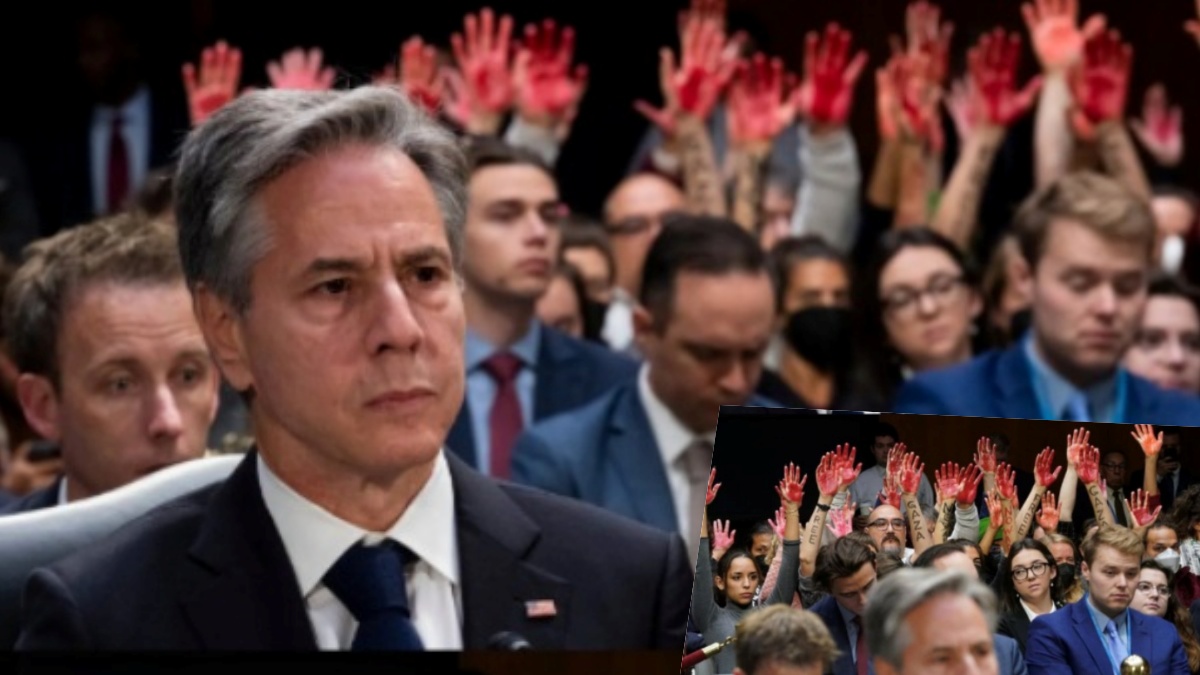 இஸ்ரேலுக்கு நிதி உதவி வழங்குவது தொடர்பாக இன்று அமெரிக்க நாடாளுமன்றத்தில் சென்ட அவையிடம் அந்நாட்டின் வெளியுறவுத்துறை செயலாளர் ஆன்டனி பிளிங்கன் கோரிக்கை வைத்தார். அப்போது அவையில் பார்வையாளர்களாக அமர்ந்திருந்த சிலர் தங்கள் கைகளை உயர்த்தினர். அவர்களின் கைகள் முழுவதும் ரத்தம் போல சிவப்பு நிற பெயின்ட் பூசப்பட்டிருந்து. அமெரிக்காவின் இந்த தீர்மானத்திற்கு ஆதரவளிப்பவர்களின் கைகளில் ரத்தக்கறை படிந்திருக்கிறது என்பதை சுட்டிக்காட்டவே இப்படி நூதன போராட்டத்தில் அவர்கள் ஈடுபட்டிருக்கின்றனர்.