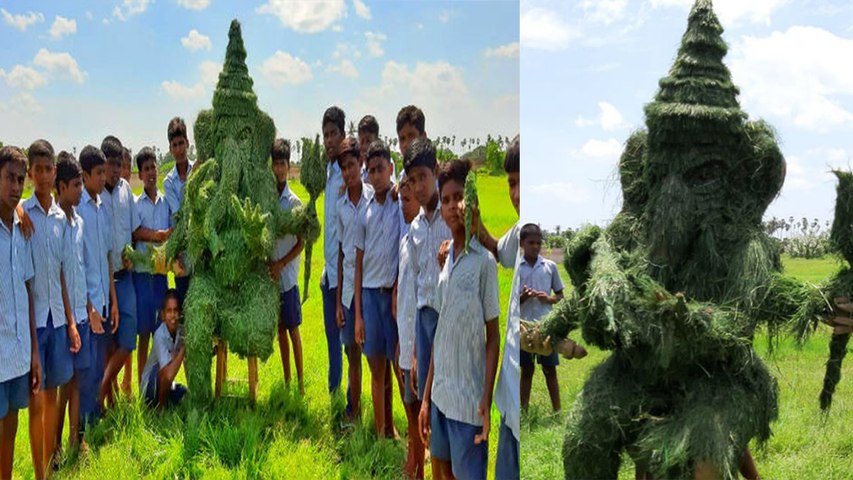 பள்ளி வளாகத்தில் இருந்த அருகம் புல் மற்றும் மூங்கில் குச்சிகளை கொண்டு இரண்டரை மணி நேரத்தில் 7 அடி உயரமுள்ள விநாயகர் சிலையை உருவாக்கி அசத்தி உள்ளனர்.