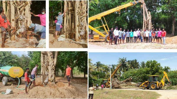 இந்நிலையில் கடந்த இரு தினங்களுக்கு முன்பு நில உரிமையாளரான விவசாயி, திடீரென அந்த ஆலமரத்தை வேருடன் பிடுங்கி ஓரமாக வைத்துவிட்டார். இதுகுறித்துத் தகவல் அறிந்த புதுச்சேரியைச் சேர்ந்த சமூக ஆர்வளர்கள் பிடுங்கியெறியப்பட்ட அந்த ஆலமரத்தைக் கைப்பற்றி, கிரேன் மற்றும் ஜேசிபி இயந்திரம் கொண்டு மீண்டும் வேறு இடத்தில் நட்டு உயிர்ப்பிக்கும் முயற்சியில் இறங்கியுள்ளனர்.