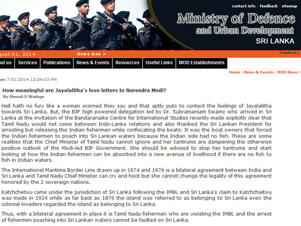 இலங்கை பாதுகாப்பு அமைச்சகத்தின் அதிகாரப்பூர்வ இணையதளத்தில் தமிழக மீனவர்கள் பிரச்சினை குறித்து முதல்வர் ஜெயலலிதா, பிரதமர் நரேந்திர மோடிக்கு எழுதி வரும் கடிதங்களை கொச்சைப்படுத்தும் வகையில் ஒரு கட்டுரை எழுதப்பட்டிருந்தது.