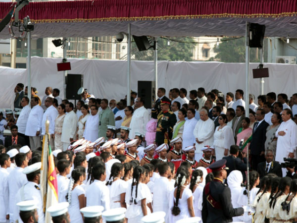 இன்றைய கொண்டாட்டத்தின் தொடக்கத்தில் சிங்கள மொழியில்தான் தேசிய கீதம் பாடப்பட்டது. இதனால் ராஜபக்சே எதிர்ப்புக்கு பயந்து தமிழில் தேசிய கீதத்தை மைத்ரிபால- ரணில் அரசு பாடவில்லை என்ற விமர்சனங்கள் எழுந்தன.