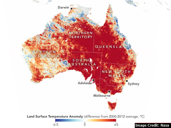 இதுதொடர்பான வரைபடம் ஒன்றை நாசா வெளியிட்டுள்ளது. தனது டெர்ரா சாட்டிலைட் மூலம் கிடைத்த புள்ளிவிவரங்களை வைத்து நாசா இந்த வரைபடத்தை உருவாக்கியுள்ளது. இதில் சிவப்பு நிறத்தில் இருப்பவை சராசரிக்கும் அதிகமான வெப்ப நிலை பதிவான பகுதிகள் ஆகும். நீல நிறத்தில் இருப்பவை சராசரிக்கும் குறைவான வெப்ப நிலை பதிவான பகுதிகள் ஆகும். வெள்ளை நிறத்தில் இருப்பவை சராசரி வெப்ப நிலை பதிவான பகுதிகள்.
