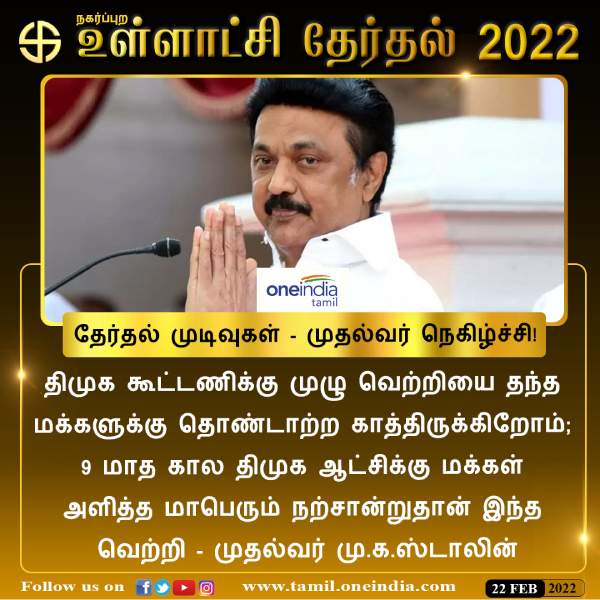 பெண்களுக்கு அதிக அங்கீகாரம் வழங்குவதுதான் நமது குறிக்கோள் - ஸ்டாலின். வெற்றி பெற்ற அனைவருக்கும் பாராட்டுக்கள் வாழ்த்துக்கள் - ஸ்டாலின். வெற்றியை ஆடம்பரமாக கொண்டாடவேண்டாம் என ஸ்டாலின் கோரிக்கை. உங்கள் மீது எந்த புகாரும் வராமல் பார்த்துக்கொள்ள வேண்டும் - ஸ்டாலின் நான் உங்களைக் கண்காணித்துக்கொண்டே இருப்பேன் - ஸ்டாலின்