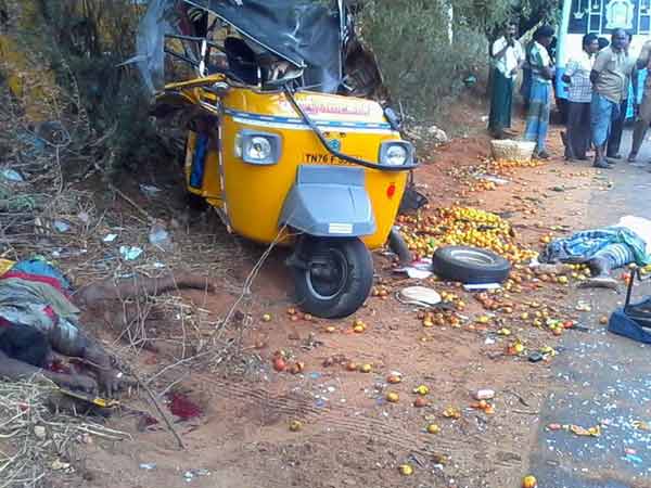 கடையநல்லூர் மின்சாரவாரிய அலுவலகம் அருகே நேற்று காலையில் கடையநல்லூர் அருகேயுள்ள கிளங்காட்டிலிருந்து கடையநல்லூர் மார்கெட்டிற்கு ஒரு பயணிகள் ஆட்டோவில் வயக்காட்டுபச்சேரி பகுதியை சார்ந்த சுப்பையா மகன் வீரமணி, முப்பிடாதி மகன் மூக்கையா ஆகிய 2 பேரும் தங்களது நிலங்களில் விளைந்த தக்காளி பழங்களை கூடையில் வைத்து கொண்டு வந்து கொண்டிருந்தனர்.