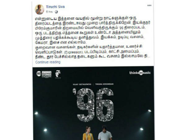 திருச்சி சிவா தனது பேஸ்புக் பதிவில் கூறியுள்ளதை பாருங்கள்: என்னுடைய இத்தனை வயதில் மூன்று நாட்களுக்குள் ஒரு திரைப்படத்தை இரண்டாவது முறை பார்த்திருக்கிறேன். இயக்குநர் பிரேம்குமாரின் திறமையில் வெளிவந்திருக்கும் '96 திரைப்படம்.