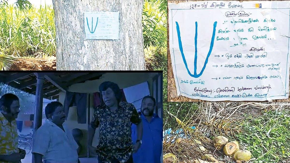 குமரவேல் வெளியூர் போய்விட்டதை எப்படியோ அறிந்து கொண்ட மர்ம கும்பல் இரவோடு இரவாக அவரது தோப்புக்குள் புகுந்து அங்குள்ள தென்னை மரத்தில் ஏறி இளநீர் குலைகளை கயிறு மூலம் கீழே இறக்கி அவற்றை வெட்டி குடித்திருக்கிறார்கள். பின்னர் குமரவேலுவை எச்சரிக்கும் வகையில் அங்கு நின்ற புளிய மரத்தில் பட்டை நாமம் வரைந்த நோட்டீஸ் ஒன்றை ஒட்டியுள்ளார்கள்.