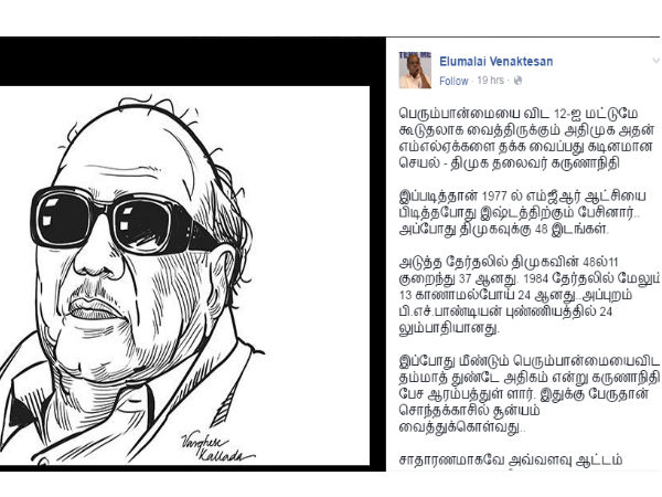 சென்னை: அதிமுகவில் பெரும்பான்மைக்கு கூடுதலாக 12 உறுப்பினர்கள் மட்டுமே உள்ளனர். எனவே அவர்களைத் தக்க வைப்பது கடினம் என்று திமுக தலைவர் கருணாநிதி கூறியுள்ளது குறித்து மூத்த பத்திரிகையாளர் ஏழுமலை வெங்கடேசன் கருத்து ஒன்றை தனது பேஸ்புக்கில் பதிவு செய்துள்ளார்.