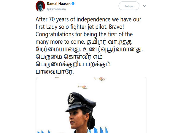 இந்நிலையில், நாட்டிலேயே முதல் பெண் விமானியான அவானி சதுர்வேதிக்கு நடிகர் கமல்ஹாசன் டிவிட்டரில் வாழ்த்து தெரிவித்துள்ளார்