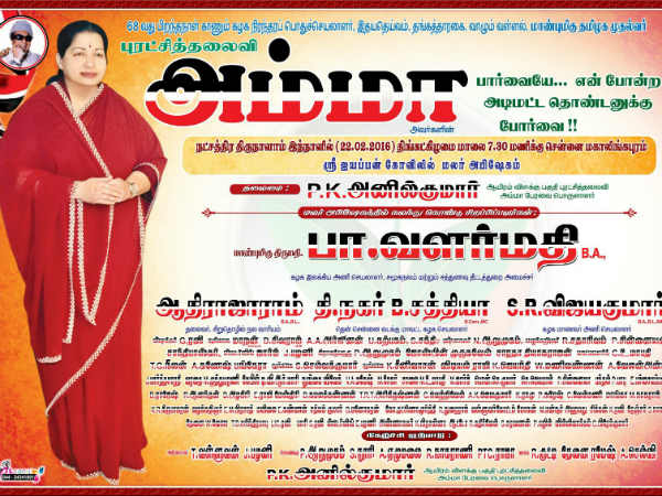 அமைச்சர் பா. வளர்மதி கலந்து கொண்ட நிகழ்ச்சி இது. 22ம் தேதி நடந்தது. இதற்கான அழைப்பிதழில் "அம்மா பார்வையே என் போன்ற அடிமட்ட தொண்டனுக்குப் போர்வை" என்று போட்டுள்ளனர்.