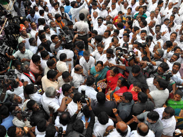 இரட்டை இலைகளை கையில் பிடித்தும், கட்சிக் கொடியுடன் மகிழ்ச்சியாக ஆட்டம், பாட்டமென அதிமுக தொண்டர்கள் ஆண், பெண் பேதமின்றி களிப்பில் ஆழ்ந்திருந்தனர்.