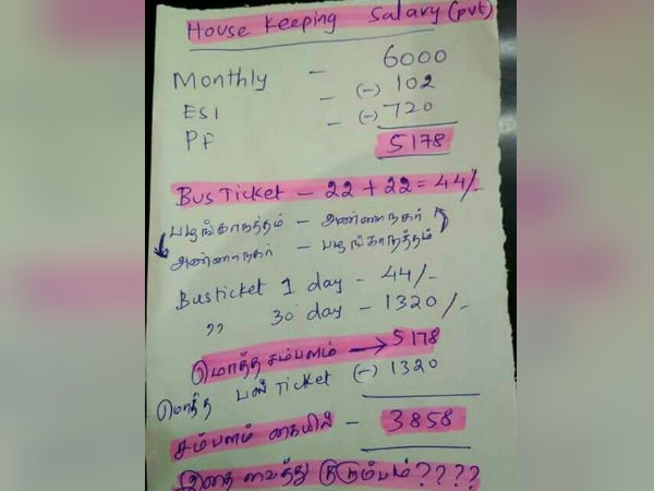 மதுரை: தமிழ்நாட்டை சேர்ந்த வீட்டு வேலைக்காரர் ஒருவரின் சம்பள பட்ஜெட் புகைப்படம் வைரல் ஆகி இருக்கிறது. அதில் வீட்டு வேலைபார்ப்பவர்களின் பேருந்து பயண கட்டணத்திற்கு செலவாகும் தொகையும் எழுதப்பட்டு இருக்கிறது.