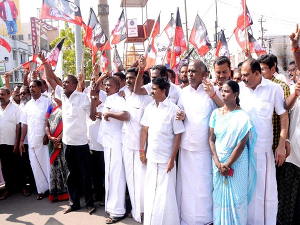 ஆனால், தமிழகத்தின் பல்வேறு இடங்களில் அதிமுகவினர் இதனை ஏற்காமல் போராட்டத்தில் ஈடுபட்டு வருகின்றனர். நாமக்கல் மாவட்டம், பரமத்தி வேலூர் பகுதியில் திரண்ட 30க்கும் மேற்பட்ட அதிமுக தொண்டர்கள், அண்ணா சிலையில் கறுப்புக்கொடி ஏற்றி தங்களது எதிர்ப்பை வெளிப்படுத்தினர். இதேபோல் வேலூர் மாவட்டம் ஆம்பூரை அடுத்த மாதனூர் பகுதியில் அதிமுக தொண்டர்கள் சாலை மறியிலில் ஈடுபட்டனர். இதனால் சுமார் 1 மணி நேரம் அந்த பகுதியில் போக்குவரத்து பாதிக்கப்பட்டது.