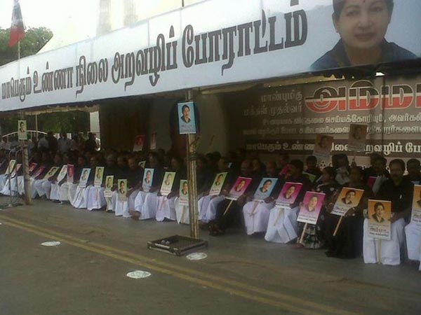 சொத்துக் குவிப்பு வழக்கில் முன்னாள் முதல்வர் ஜெயலலிதா சிறையில் அடைக்கப்பட்டதைக் கண்டித்து அதிமுகவினர் தொடர் போராட்டங்களை நடத்தி வருகின்றனர். டெல்லியில் நாடாளுமன்ற வளாகம் முன்பாக அதிமுக எம்.பிக்கள் நேற்று முன் தினம் உண்ணாவிரதப் போராட்டம் நடத்தினர்.