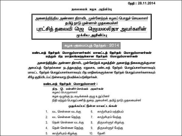 அ.தி.மு.க. அமைப்புகளுக்கான தேர்தல் வருகின்ற டிசம்பர் 11 ஆம் தேதி முதல் அடுத்த ஆண்டு ஏப்ரல் 25 ஆம் தேதி வரை 14 கட்டங்களாக நடைபெற உள்ளது. எனவே அமைப்புத் தேர்தலுக்கான பொறுப்பாளர்களை அக்கட்சியின் பொதுச்செயலாளர் ஜெயலலிதா தற்போது அறிவித்துள்ளார்.