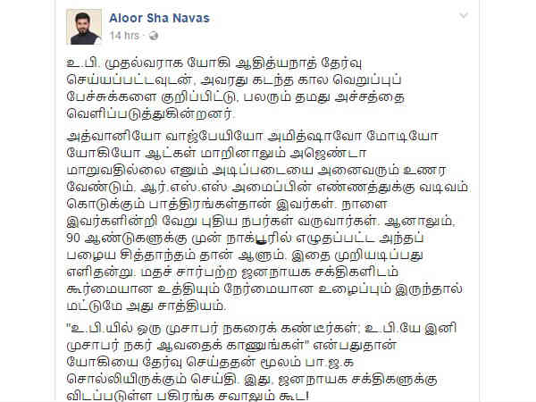 உபி முதல்வராக யோகி தேர்வு.... ஜனநாயக சக்திகளுக்கு விடப்படுள்ள பகிரங்க சவால்: ஆளூர் ஷாநவாஸ்