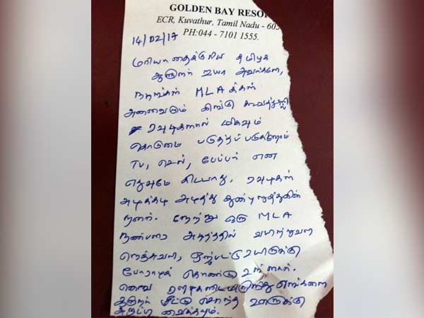 இதை எழுதியது யார் என்பது தெரியவில்லை. எம்.எல்.ஏக்கள்தான் தற்போது அங்கு வலுக்கட்டாயமாக தங்க வைக்கப்பட்டுள்ளனர் என்பதால் இது பெரும் பரபரப்பைக் கிளப்பியுள்ளது. இது உண்மையா என்றும் தெரியவில்லை. அதேசமயம், கோல்டன் பே ரிசார்ட் பேப்பரில் எழுதி வந்துள்ளதால் இதைப் புறக்கணிக்கவும் முடியவில்லை.