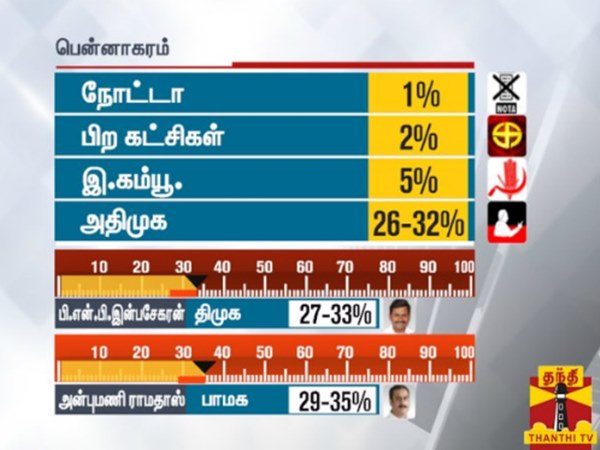 பென்னாகரம் தொகுதியில் பாமகவுக்கு 29 - 35 சதவீத ஆதரவு காணப்படுவதாக கருத்துக் கணிப்பு கூறுகிறது. திமுகவுக்கு 27 - 33 சதவீத ஆதரவு கிடைத்துள்ளது. அதேசமயம் அதிமுகவுக்கு 26 - 32 சதவீத ஆதரவுடன் 3வது இடத்துக்கு தள்ளப்பட்டுள்ளது.