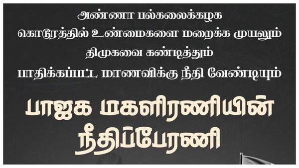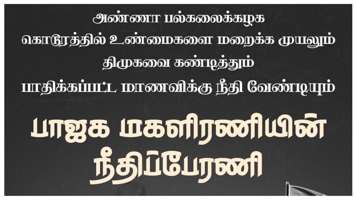 இது தொடர்பாக தமிழ்நாடு பாஜக தலைவர் அண்ணாமலை கூறுகையில் அண்ணா பல்கலைக்கழக மாணவிக்கு நேர்ந்த கொடுமையைக் கண்டித்தும், குற்றவாளி திமுகவைச் சேர்ந்தவன் என்பதால், முழு உண்மைகளையும் வெளிக்கொண்டு வராமல் மறைக்க திமுக அரசு முயற்சி செய்வதையும் கண்டித்து, பாஜக மகளிர் அணி சார்பில் மதுரையில் இருந்து சென்னை வரை, நீதிப்பேரணி நடைபெறவுள்ளது. வரும் ஜனவரி 3 அன்று தொடங்கவிருக்கும் இந்தப் பேரணி, சென்னையில் நிறைவு பெறும்போது தமிழக ஆளுநரைச் சந்தித்து பாஜக மகளிர் அணி சார்பில் தங்கள் கோரிக்கை மனுவை வழங்க முடிவு செய்யப்பட்டுள்ளது என்றார்
