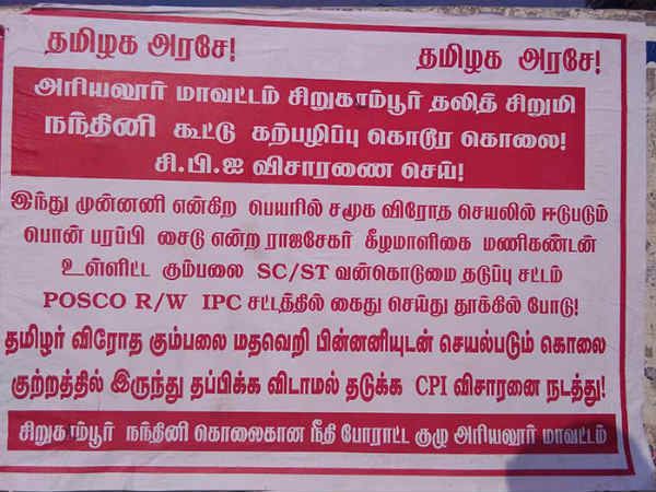 திருச்சி: அரியலூர் அருகே தலித் பெண் நந்தினியை காதலிப்பதாக கூறி கர்ப்பமாக்கிவிட்டு நண்பர்களுடன் சேர்ந்து பலாத்காரம் செய்து படுகொலை செய்திருக்கிறார் இந்து முன்னணி நிர்வாகி மணிகண்டன. அத்துடன் நந்தினியின் பெண் உறுப்பை பிளேடால் அறுத்து 5 மாத சிசுவை வெளியே எடுத்து வீசிய கொடூரத்தையும் மணிகண்டன் செய்திருக்கிறார்.