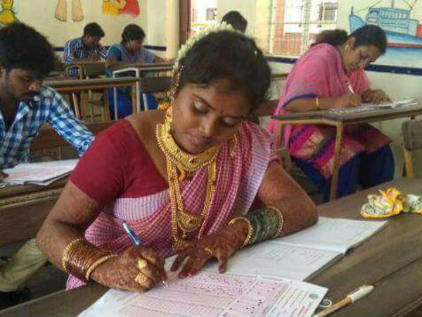 விழுப்புரத்தில் தாலி கட்டிய அடுத்த நிமிடம் கல்யாண மண்டபத்தில் இருந்து நேராக டிஎன்பிஎஸ்சி தேர்வு எழுத பி.இ. பட்டதாரிப் பெண் ஒருவர் சென்றார்.