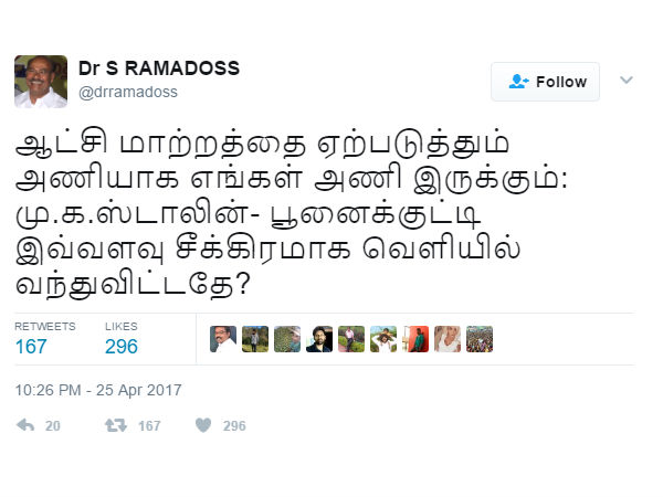 இந்நிலையில அனைத்து அரசியல் நிகழ்வுகளையும் தனது டிவிட்டர் பக்கத்தில் போட்டு விளாசும் பாமக நிறுவனர் ராமதாஸ் ஸ்டாலினின் பேச்சு குறித்தும் கருத்து தெரிவித்துள்ளார். அதாவது ஆட்சி மாற்றத்தை ஏற்படுத்தும் அணியாக எங்கள் அணி இருக்கும் என ஸ்டாலின் கூறியதை மேற்கோள் காட்டியுள்ள அவர் பூனைக்குட்டி இவ்வளவு சீக்கிரமாக வெளியில் வந்துவிட்டதே என தெரிவித்துள்ளார்.