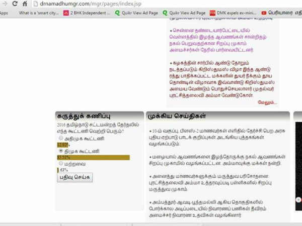 அதிமுக நாளிதழ் பெயர் ‘நமது எம்ஜிஆர்'. இதன் இணையதள பக்கத்தில் 3 நாட்களுக்கு முன்பு, ‘2016-ம் ஆண்டு தமிழ்நாடு சட்டமன்றத் தேர்தலில் எந்த கூட்டணி வெற்றி பெறும்' என்ற தலைப்பில் ஒரு கருத்துக்கணிப்பு கேட்கப்பட்டிருந்தது. அதில் அதிமுக கூட்டணிக்கு ஆதரவாக 13 சதவீதம் பேர் மட்டுமே கருத்து தெரிவித்திருந்தனர். திமுக கூட்டணிக்கு 85 சதவீதம் பேர் வாக்களித்திருப்பதை போல காண்பித்தது.