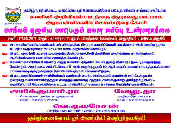 கணினி அறிவியல் படத்தை 6வது பாடமாக ஆக்க வேண்டும்; அரசு பள்ளிகளில் தனியார் பள்ளிகளுக்கு நிகராக கணிப்பொறி பாடத்தை 1ம் வகுப்பு முதல் 10ம் வகுப்பு வரை கட்டாய பாடமாக அறிவிக்க வேண்டும்.