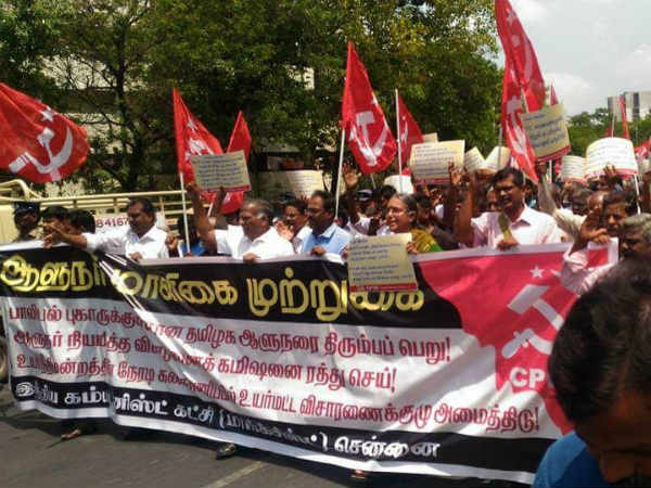 இதே கோரிக்கையை முன்வைத்து சென்னையில் இன்று மார்க்சிஸ்ட் கட்சியினர் ஆளுநர் மாளிகை முற்றுகைப் போராட்டம் நடத்தினர். அப்போது ஆளுநர் அமைத்த சந்தான விசாரணை கமிஷனை ரத்து செய்யவும் வலியுறுத்தி முழக்கங்கள் எழுப்பப்பட்டன.