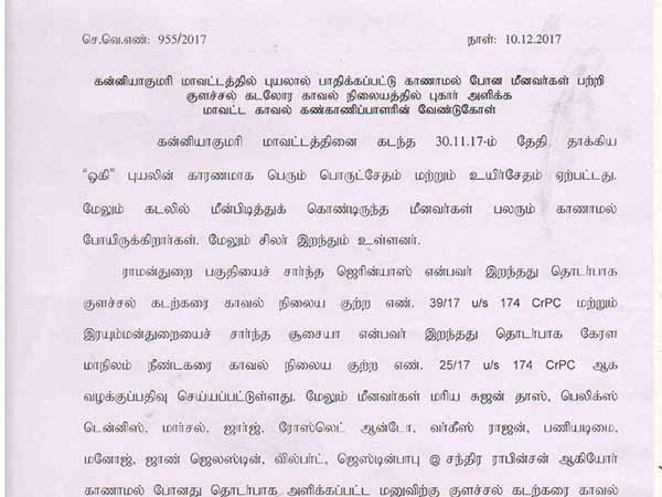 ஓகி புயலில் சிக்கி மாயமான மீனவர்களைப் பற்றி குளச்சல் கடலோர காவல்நிலையத்தில் புகார் அளிக்கலாம் என கன்னியாகுமரி மாவட்ட எஸ்.பி வேண்டுகோள் விடுத்துள்ளார்.