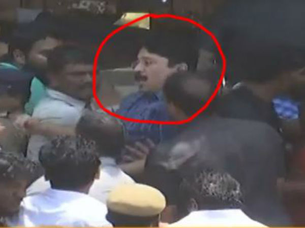 கருணாநிதிக்கு அஞ்சலி செலுத்த சுவர் ஏறி குதித்த தொண்டர்களால் தள்ளுமுள்ளில் தயாநிதி மாறன் சிக்கினார்.