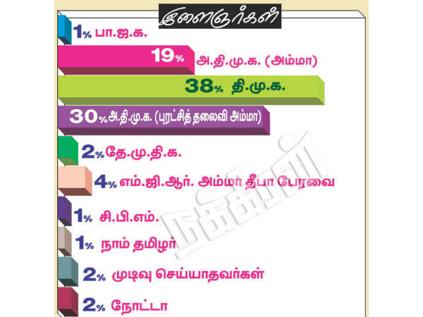 சென்னை: ஆர்.கே. நகர் இடைத்தேர்தலில் திமுக வேட்பாளர் மதுசூதனனுக்கு வாக்களிப்போம் என்று 38% இளைஞர்கள் கருத்து கூறியுள்ளதாக நக்கீரன் சர்வே தெரிவித்துள்ளது.