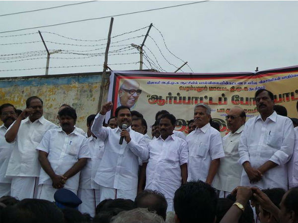 இதே போல் திருவள்ளூர் மாவட்ட தி.மு.க. சார்பில் திருவள்ளூர் அண்ணா திடலில் மாவட்ட பொறுப்பாளர் மாதவரம் சுதர் சனம் தலைமையில் ஆயிரக்கணக்கான தி.மு.க. வினர் பங்கேற்று கண்டன ஆர்ப்பாட்டம் நடத்தினர்.