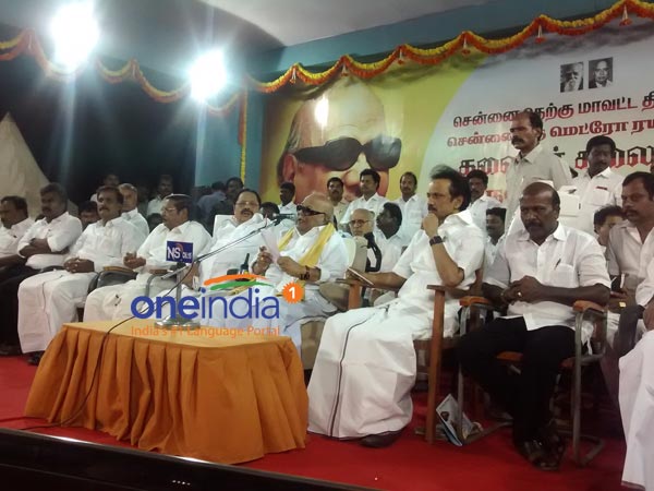 தென்சென்னை மாவட்ட திமுக சார்பில், மெட்ரோ ரயில் திட்டத்தை கொண்டுவந்ததற்காக திமுக தலைவர் கருணாநிதி, பொருளாளர் மு.க.ஸ்டாலின் ஆகியோருக்கு ஆலந்தூரில் இன்று பாராட்டு விழா நடத்தப்பட்டது.