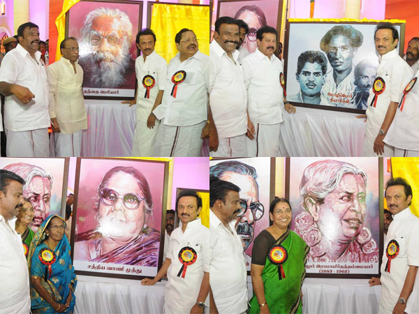 புரட்சி கவிஞர் பாரதிதாசன் படத்தை கவிதை பித்தனும், மூவாலூர் மூதாட்டியார் படத்தை சுப்புலட்சுமி ஜெகதீசனும், சத்தியவாணிமுத்து படத்தை நூர்ஜகான்பேகமும், மொழிப்போர் தியாகிகள் உருவபடத்தை பொன்முடியும் திறந்து வைத்து உரையாற்றினர்.