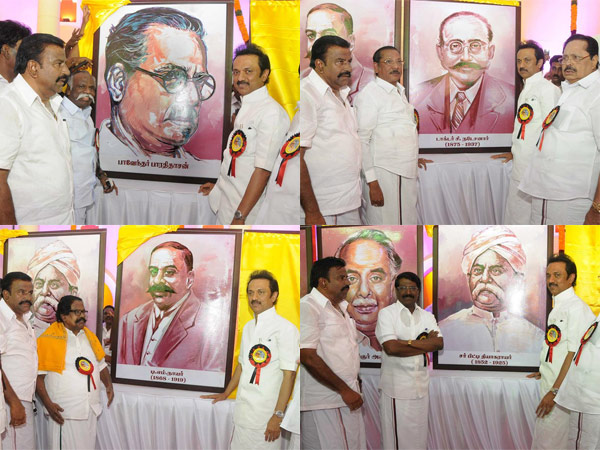 தந்தை பெரியார் படத்தை திமுக வெளியீட்டு செயலாளர் செல்வேந்திரனும், அண்ணா உருவபடத்தை திருச்சி சிவா எம்.பி.யும், சர்.பிட்டி தியாகராயர் படத்தை சபாபதி மோகனும், டி.எம்.நாயர் படத்தை கோவை மு.ராமநாதனும், டாக்டர் நடேசனார் படத்தை ஆலந்தூர் பாரதியும்,