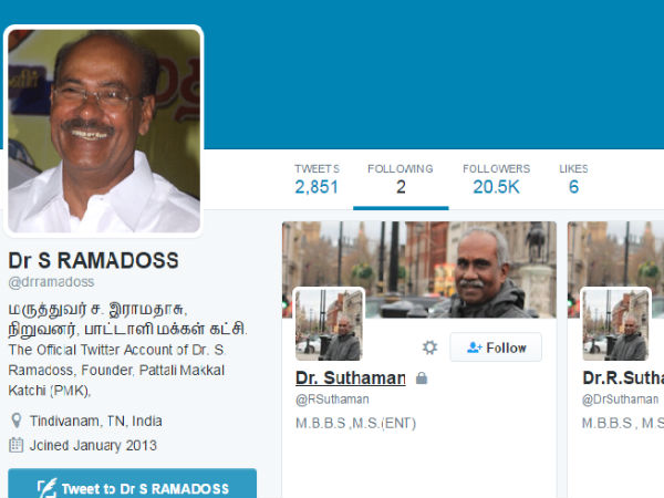 கடந்த 2013ம் ஆண்டு ஜனவரி மாதம் ட்விட்டரில் சேர்ந்த ராமதாஸை தற்போது வரை 20 ஆயிரத்து 455 பேர் பின்தொடர்கிறார்கள். ஆனால் அவர் ஒரேயொரு நபரை மட்டும் தான் ட்விட்டரில் பின்தொடர்கிறார்.