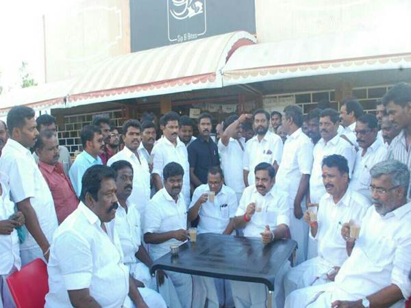பின்னர் ஸ்டாலின், ஓபிஎஸ் பாணியில் அமைச்சர்கள் விஜயபாஸ்கர், வெல்லமண்டி நடராஜன் மற்றும் நிர்வாகிகள் புடை சூழ டீ சாப்பிட்டுக் கொண்டே பேசிக்கொண்டு இருந்தார் எடப்பாடி பழனிச்சாமி. இந்த டீ கடையில் சுவாரஸ்யம் என்னவென்றால் டீ சுவையாக இருந்தால் வாடிக்கையாளர்கள் கடை முன்பு உள்ள மணியை அடித்துச் செல்வது வழக்கமாம்.