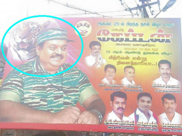 இந்த நிலையில் ஆரணி தேமுதிகவினர் வைத்த பேனர் ஒன்று சர்சையாக உலகம் முழுவதும் வெடித்துள்ளது. விஜயகாந்த் பிறந்த நாளுக்காக வைக்கப்பட்ட பேனர் ஒன்றில் விடுதலைப் புலிகள் இயக்க சீருடையில் அந்த இயக்கத்தின் தலைவர் பிரபாகரன் இருக்கும் படம் ஒன்றில் பிரபாகரன் முகத்தை நீக்கிவிட்டு விஜயகாந்த் படத்தை மார்பிங் செய்து வைத்திருக்கின்றனர்.