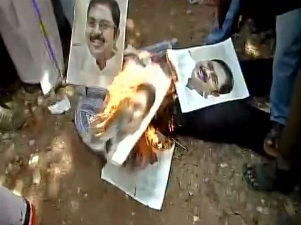 இந்நிலையில் முன்னாள் சட்டமன்ற உறுப்பினர் ஓம்சக்தி சேகர் தலைமையிலான அதிமுகவினர் கட்சிக் கொடியேந்தி ரெசார்ட் நோக்கி பேரணியாக சென்றனர். போலீசார் அவர்களை பேரிகாட் வைத்து தடுத்து நிறுத்தினர். எனினும் தடுப்பு வேலிகளை உடைத்துக் கொண்டு சென்ற அதிமுகவினர் டிடிவி. தினகரனின் படங்களை கையில் வைத்துக் கொண்டு அவற்றை காலணியால் அடித்ததோடு தீ வைத்தும் கொளுத்தினர்.