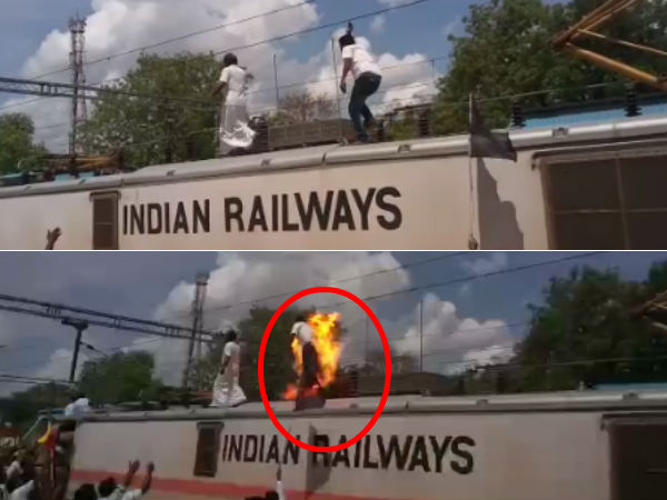 பாமக போராட்டத்தில் பரபரப்பு.. ரயில் மீது ஏறி நின்று போராடிய தொண்டர் மீது மின்சாரம் பாய்ந்தது!