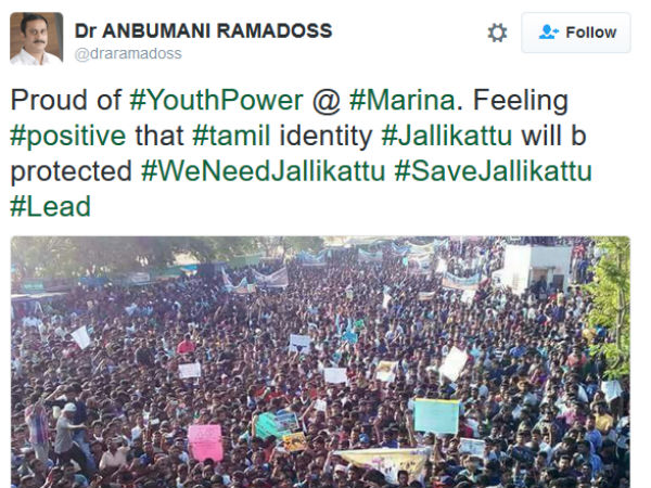 இந்தப் பேரணி குறித்து பாமக இளைஞர் அணித் தலைவர் டாக்டர் அன்புமணி பாராட்டு தெரிவித்துள்ளார். இதுகுறித்து அவர் போட்டுள்ள டிவீட்டில், இளைஞர் படையைப் பார்த்து பெருமைப்படுகிறேன். தமிழர்களின் அடையாளமான ஜல்லிக்கட்டு காப்பாற்றப்படும் என்ற உணர்வு வருகிறது என்று மகிழ்ச்சியும், வாழ்த்தும் தெரிவித்துள்ளார் அன்புமணி.