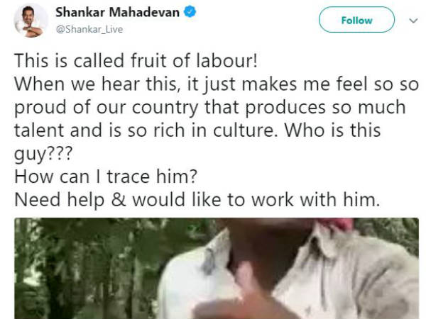 இந்த வீடியோ சமூக வலைதளங்களில் வைரலானது. இதை பார்த்து சங்கர் மகாதேவன் பிரமித்தார். அவர் தனது டுவிட்டரில் இவர் பாடும் பாட்டை கேட்டவுடன் எனக்கு பெருமையாக உள்ளது. நம் நாட்டில் எத்தனை பேர் இத்தனை திறமைகளுடன் இருக்கிறார்கள் என்பதை நினைத்து மகிழ்ச்சியாக உள்ளது.