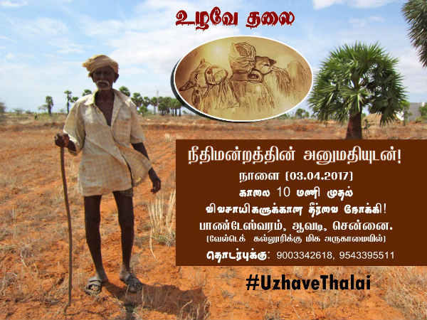 கடந்த சனிக்கிழமை சென்னை ஒய்.எம்.சி.ஏ மைதானத்தில் உழவே தலை என்ற இளைஞர்கள் அமைப்பு சார்பில் விவசாயிகளுடன் இணைந்து போராட்டம் நடத்த ஏற்பாடு நடைபெற்றது. போலீஸ் தரப்பில் அழுத்தம் கொடுக்கப்பட்டதால் ஒய்எம்சிஏ நிர்வாகம் கொடுத்த அனுமதியை வாபஸ் பெற்றுள்ளார்கள்.