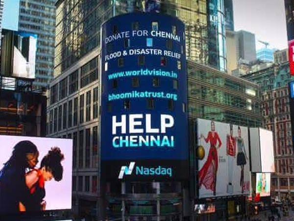சென்னை மக்களுக்காக பூமிகா அறக்கட்டளை, வேர்ல்டு விஷன் உள்ளிட்டவை நிதி திரட்டி அனுப்பி வைக்கின்றன. இந்நிலையில் அமெரிக்காவின் நியூயார்க் நகரில் சென்னைக்கு உதவி செய்யக் கோரி பூமிகா அறக்கட்டளையும், வேர்ல்டு விஷனும் டிஜிட்டல் போஸ்டர் போட்டுள்ளது.