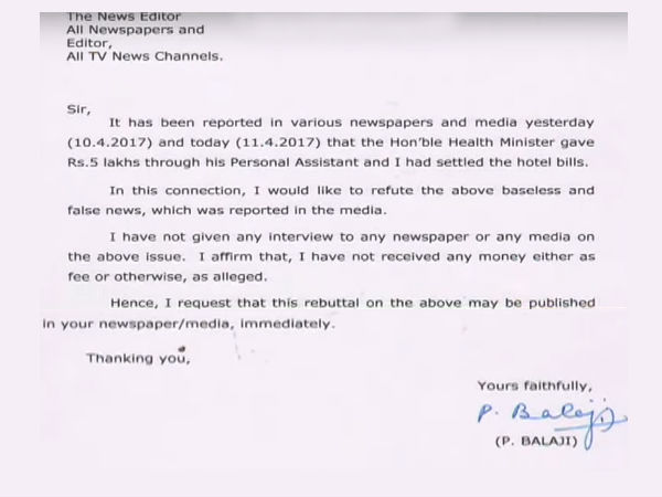 சுகாதாரத்துறை அமைச்சர் தனது உதவியாளர் மூலம் ரூ.5 லட்சம் பணத்தை எனக்கு தந்ததாகவும், நான் ஹோட்டல் பில்லை கட்டியதாகவும் செய்திகள் வெளியாகியுள்ளன. இது ஒரு அடிப்படையற்ற, பொய் செய்தியாகும் என பாலாஜி கூறியுள