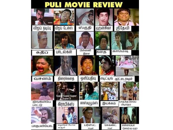 இந்நிலையில் வித்தியாசமாக புலி படத்தை விமர்சித்துள்ளனர் வாட்ஸ் அப்பில். இது தொடர்பாக படம் ஒன்று வாட்ஸ் அப்பில் உலா வருகிறது. அதில், விஜயின் நடிப்பு, டான்ஸ், ஸ்ரீதேவி, ஹன்சிகா, மியூசிக், கிராபிக்ஸ் என ஒவ்வொன்றிற்கும் வித்தியாசம் வித்தியாசமான புகைப்படங்களை வைத்து லகலக செய்துள்ளார்கள்.