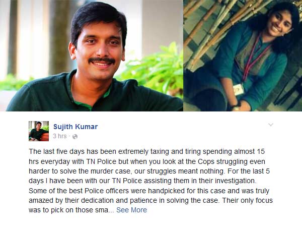 சென்னை: சுவாதி கொலையாளியை கைது செய்ய போலீசார் பட்ட கஷ்டங்களை உடன் இருந்து பார்த்த இன்போசிஸ் நிறுவன மனிதவள மேம்பாட்டு அதிகாரி (ஹெச்.ஆர்.) சுஜித் குமார் தனது பேஸ்புக் பக்கத்தில் விவரித்துள்ளார்.