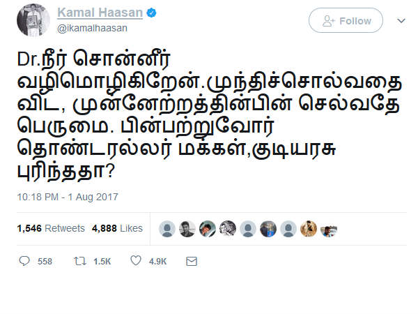 முன்னேற்றத்தின் பின் செல்வதே பெருமை: கமல்ஹாசன் 'ட்வீட்'